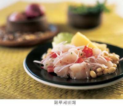 페루 방문 시 꼭 먹어봐야 할 음식으로는 페루의 신선한 해산물과 생선회를 이용한 세비체(Ceviche)가 대표적이다. 또한 피스코 사워(Pisco sour) 역시 꼭 마셔봐야 할 대표적 술로 페루의 전통 브랜디인 피스코와 라임즙, 달걀흰자 등을 섞어 만든 페루의 ‘국민 칵테일’이다.