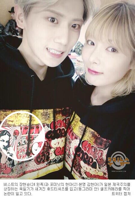 [쿠키 연예] 비스트의 장현승(24)과 포미닛의 현아(21·본명 김현아)가 일본 제국주의를 상징하는 욱일기가 새겨진 후드티셔츠를 입고 셀프카메라를 찍어 논란이 일고 있다. 네티즌들의 비난이 빗발치고 있다.