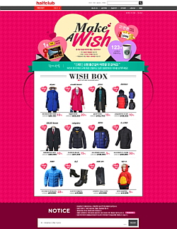 하프클럽은 이러한 설문 결과를 토대로 선호 1~3위까지의 선물들로 구성 된 고객 만족 이벤트인 ‘Make a wish’ 행사를 다음달 2~4일까지 진행한다. 하프클럽 MD들이 꼽은 남녀별 겨울 코트 및 다운 점퍼, 덕다운 재킷 등 겨울 아우터와 퍼(fur)부츠, 가죽장갑 등 총 12개 아이템에서 크리스마스때 선물로 받고 싶거나 구매하고 싶은 제품을 골라 그 이유를 적어준 고객 전원에게 적립금 1천원을 지급한다.