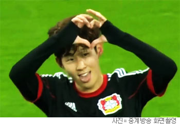 손흥민은 1일 독일 레버쿠젠 바이아레나에서 열린 뉘른베르크와의 2013~2014시즌 독일 프로축구 분데스리가 14라운드 홈경기에서 후반 31분 두 번째 골을 넣은 뒤 관중석을 향해 두 팔을 높이 들어 손가락으로 하트를 만들어 보냈다.