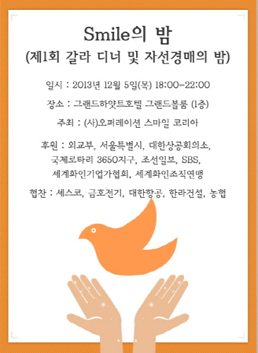 금번 행사는 '오퍼레이션 스마일 코리아' 홍보대사로 활약 중인 아나운서 박태원과 방송인 이지연이 사회를 맡아 2013년 12월 5일 목요일 오후 6시부터 10시까지 서울 그랜드하얏트호텔 그랜드볼룸에서 진행된다.