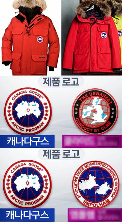짝퉁 제품들은 캐나다 구스의 상징인 북극해 지도를 비슷하게 사용해 부착하고 있다. 코리아 구스 제품들은 모두 털 달린 모자와 주머니의 개수 등도 캐나다 구스와 거의 흡사하게 제작하고 있다. 기사에는 심지어 캐나다 구스 로고만 따로 파는 곳이 있을 정도이며, 캐나다 구스 측이 법적 대응을 준비하고 있다는 내용으로 돼있다.