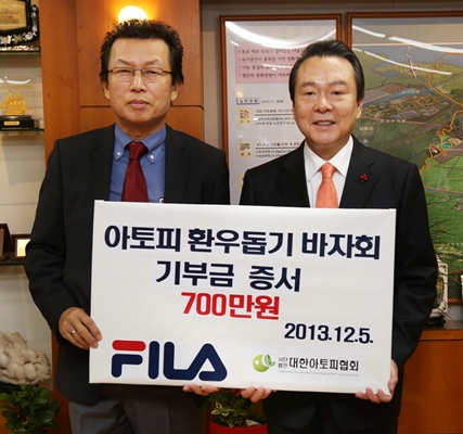 [쿠키 생활] 휠라코리아(주)(대표 윤윤수·이기호)는 5일 오전 강서구청에서 이기호 휠라코리아 사장과 노현송 강서구청장을 비롯한 관계자들이 참석한 가운데 아토피 환우 돕기 자선바자회 수익금을 강서구청에 기부했다.