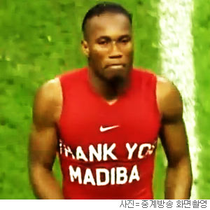 드로그바의 동료 수비수 에마뉘엘 에부에(30·코트디부아르)도 유니폼 상의를 벗고 ‘만델라여, 영면하소서(Rest in Peace Nelson Mandela)’라는 문구를 관중에게 보였다. 조국의 내전 등 아프리카의 정치적 혼란과 흑인의 인권 문제를 해결하기 위해 장외에서 노력해온 두 선수가 만델라에게 표한 경의였다.