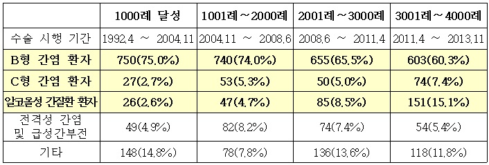 지금까지 4천번째 간이식을 시행한 서울아산병원 장기이식센터 간이식팀이 매 1,000례 당 간이식 환자의 원인 변화 추이를 분석한 결과, 2004년 말(1,000례 달성 시점) 전체 간이식 원인의 75.0%를 차지했던 B형 간염 비중은 2013년 말(4,000례 달성 시점) 60.3%로 떨어진 반면, C형 간염에 의한 원인은 2.7%에서 7.4%로 증가한 것으로 나타났다.