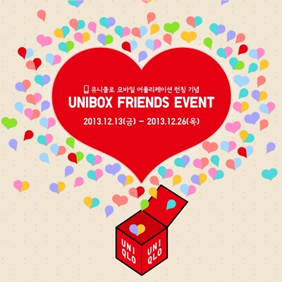 [쿠키 생활] 글로벌 SPA 브랜드 유니클로(UNIQLO)가 모바일 앱 론칭을 기념해 12월 13일부터 26일까지 유니클로 공식 페이스북(www.facebook.com/uniqlo.kr)을 통해 유니박스에 담긴 ‘엑스트라 웜 히트텍(Extra Warm HEATTECH)’을 총 1,000명에게 증정하는 ‘유니박스 프렌즈(UNIBOX FRIENDS)’ 이벤트를 진행한다.