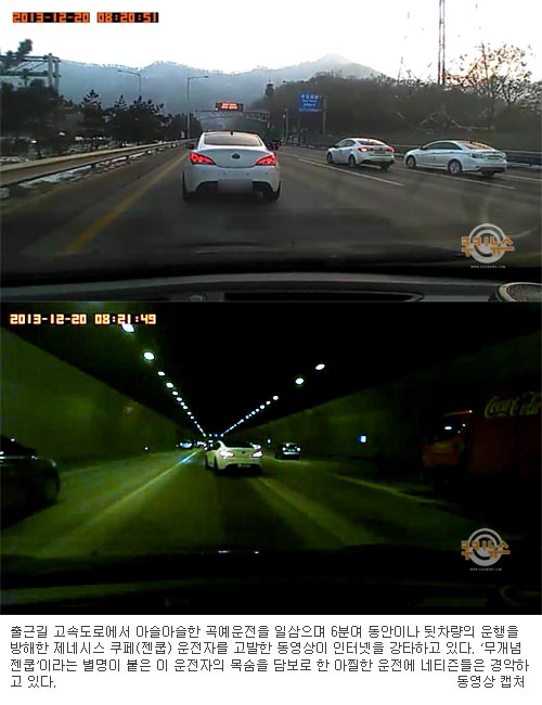 [쿠키 사회] 출근길 고속도로에서 아슬아슬한 곡예운전을 일삼으며 6분여 동안이나 뒷차량의 운행을 방해한 제네시스 쿠페(젠쿱) 운전자를 고발한 동영상이 인터넷을 강타하고 있다. ‘무개념 젠쿱’이라는 별명이 붙은 이 운전자의 목숨을 담보로 한 아찔한 운전에 네티즌들은 경악하고 있다.
