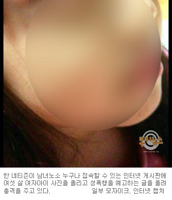 [쿠키 사회] 한 네티즌이 남녀노소 누구나 접속할 수 있는 인터넷 게시판에 여섯 살 여자아이 사진을 올리고 성폭행을 예고하는 글을 올려 충격을 주고 있다. 문제의 게시판에는 소아성애 뿐만 아니라 성매매나 성폭행 등과 관련된 음란글이 쉴 새 없이 오르고 있는데도 별다른 제재 없이 운영되고 있다.
