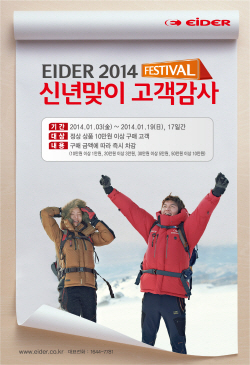 [쿠키 생활] 프랑스 아웃도어 브랜드 아이더는 청마의 해 갑오년(甲午年)을 맞아 오는 19일까지 구매 고객에게 최대 10만원 상당의 상품권을 지원하는 ‘2014 아이더 신년맞이 고객감사 페스티벌’을 진행한다.