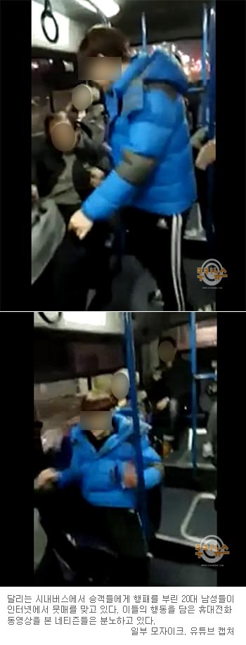 [쿠키 사회] 달리는 시내버스에서 승객들에게 행패를 부린 20대 남성들이 인터넷에서 뭇매를 맞고 있다. 이들의 행동을 담은 휴대전화 동영상을 본 네티즌들은 분노하고 있다.