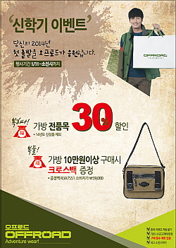 오프로드는 신학기를 앞둔 학생들을 위해 11일부터 가방 제품 전품목을 30% 할인 판매(2014 신상품 제외)한다. 오프로드 가방 제품 10만원이상 구매 시 ‘헤들라크로스백’(5만9천원 상당)을 증정한다. 헤들라크로스백은 깔끔한 컬러와 로고 패치로 포인트를 준 사각 캔버스 크로스백으로 넉넉한 내부가 장점인 제품이다. 이번 행사는 제품 소진 시까지 진행되며, 구매 횟수 제한은 없다.