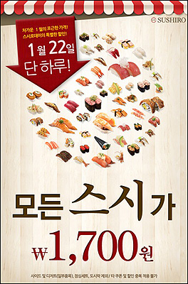 [쿠키 생활] 회전초밥 레스토랑 스시로한국은 오는 22일 스시로데이를 맞아 전 고객들을 대상으로 1700원 균일가 프로모션을 진행한다고 밝혔다.