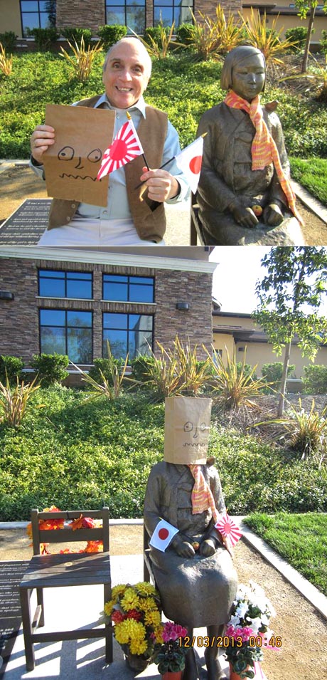 그는 인터뷰에서 소녀상 얼굴을 ‘못난이’라고 조롱한 것에 대해 “미군 병사가 1944년 위안부를 체포하면서 한 말을 그대로 옮긴 것”이라며 “너무 못생겼다면 일본 군인들이 종이봉투를 뒤집어씌우고 (관계를) 했어야 하지 않았나는 의미로 장난친 것”이라는 막말까지 서슴지 않았다.