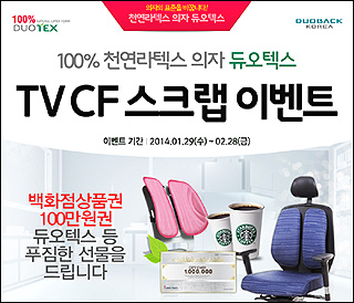 [쿠키 생활] 듀오백코리아㈜가 천연라텍스 의자 ‘듀오텍스’의 TV-CF 방영을 기념해 오는 28일까지 스크랩 이벤트를 실시한다.