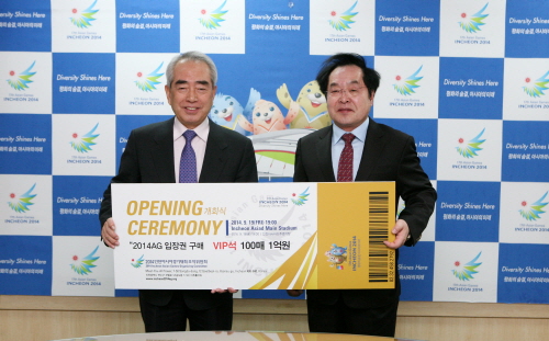 [쿠키 건강] 가천대 길병원은 4일 송도국제도시 내 2014인천아시아경기대회조직위원회를 방문해 대회의 성공적 개최를 기원하며 개회식 VIP 입장권 100매(1억원 상당)를 구입했다.