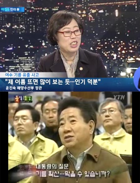 [쿠키 정치] 윤진숙(59) 해양수산부 장관이 기름유출 사고와 관련해 연일 부적절한 언행으로 물의를 빚는 가운데 인터넷에서는 고(故) 노무현 전 대통령이 2007년 태안 기름 유출 사고 당시 현장을 방문했던 ‘돌발영상’이 새삼 인기를 끌고 있다.