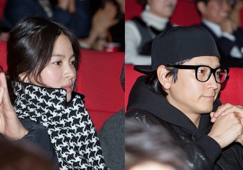 송혜교는 옅은 화장에 패턴 무늬가 들어간 코트를 입었고, 강동원은 뿔테 안경과 후드티 차림에 캡 모자를 뒤로 써서 소년 같은 모습을 연출해 눈길을 끌었다. 두 사람은 옆 자리에 함께 앉아 영화를 본 것은 아니지만 이들을 향한 관심은 뜨거웠다.
