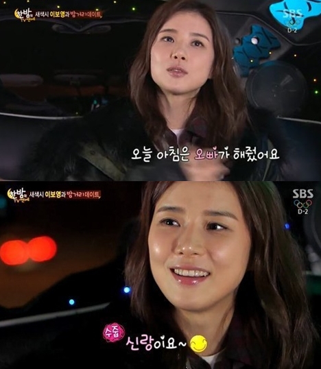 5일 방송된 SBS ‘한밤의 TV연예’에 출연한 이보영은 남편 지성과의 알콩달콩한 일상을 공개하며 애정을 과시했다.