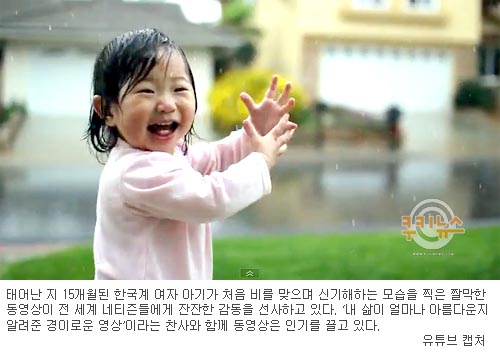 [쿠키 지구촌] 태어난 지 15개월된 한국계 여자 아기가 처음 비를 맞으며 신기해하는 모습을 찍은 짤막한 동영상이 전 세계 네티즌들에게 잔잔한 감동을 선사하고 있다. ‘내 삶이 얼마나 아름다운지 알려준 경이로운 영상’이라는 찬사와 함께 동영상은 높은 인기를 끌고 있다.