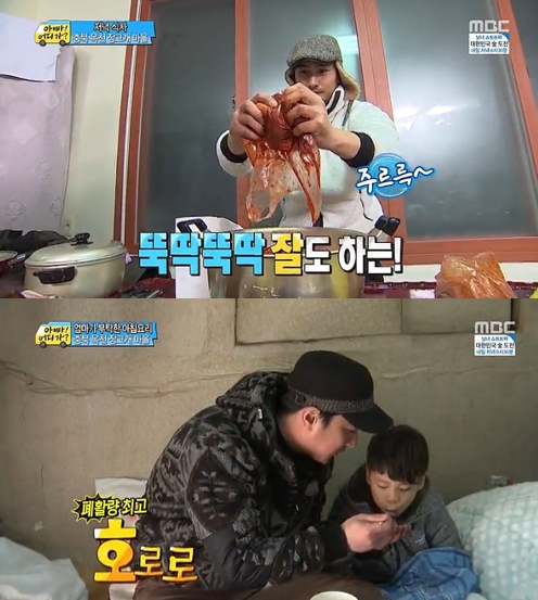 상을 다 차린 후에는 아들에게 밥을 먹여주기도 했다. “추우니까 아빠가 먹여준다”면서 시크하게 말했지만 다정한 아빠의 모습이었다.