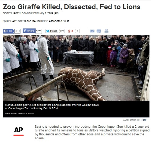 9일(현지시간) 코펜하겐 동물원은 두 살배기 수놈 기린 ‘마리우스’를 총으로 쏴 죽이고 사체를 해체해 사자에게 먹이로 줬다. 근친교배를 막기 위해서였다는 것이 이유였다. 문제는 이 광경을 수많은 관람객들이 지켜보고 있었다는 것. 이들 중 대다수는 어린이였다.