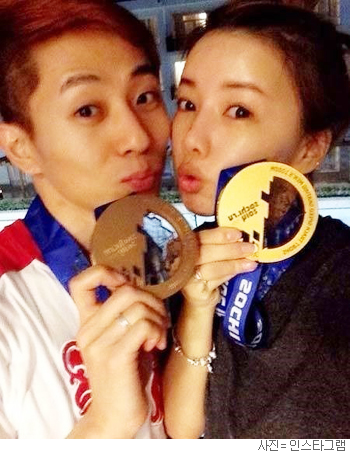 [쿠키 스포츠] ‘쇼트트랙 황제’ 안현수(러시아명 빅토르 안·29)가 국적을 바꾸고 처음 차지한 올림픽 금메달을 여자친구 우나리(30)씨의 목에 걸었다.