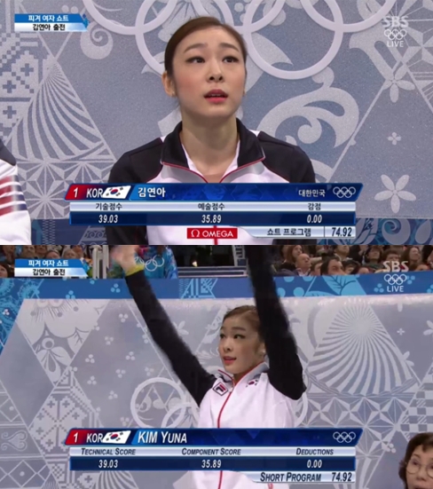 20일(한국시간) 러시아 소치의 아이스버그 스케이팅 팰리스에서 열린 2014년 소치동계올림픽 피겨스케이팅 여자 싱글 쇼트프로그램에서 김연아는 흠잡을 데 없는 경기력을 선보이며 시즌 최고점을 기록했다. 기술점수(TES) 39.03점, 예술점수(PCS) 35.89점을 받아 합계 74.92점의 성적을 받았다. 고개를 갸웃거릴 수밖에 없는 결과였다. 김연아도 점수에 불만을 느낀 듯 “아, 짜다”는 입모양으로 한 차례 속삭인 뒤 고개를 끄덕이며 신혜숙 코치를 보고 웃었다.