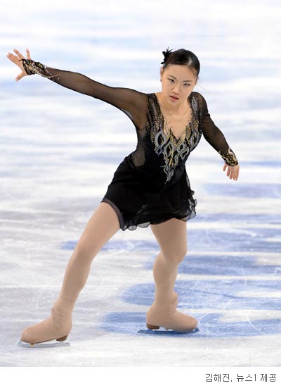 영화 ‘블랙스완’의 사운드트랙 음악에 맞춰 프리스케이팅 연기를 펼친 김해진은 첫 번째 트리플 러츠-더블 토루프 콤비네이션 점프때 회전이 살짝 부족한 모습을 보였다.