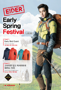 [쿠키 생활] 프랑스 아웃도어 브랜드 아이더는 다음달 2일까지 ‘아이더 얼리 스프링 페스티벌(Eider Early spring Festival)’ 이벤트을 진행한다고 밝혔다. 아웃도어 활동이 많아지는 봄을 앞두고 고객들이 보다 실속 있게 봄 산행을 준비할 수 있도록 풍성한 혜택을 마련했다.