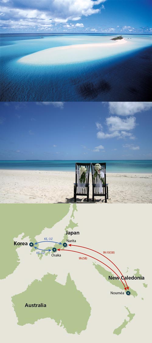 이달 초부터 뉴칼레도니아로 출발하는 인천 직항노선이 없어지기 때문에 일본을 경유해야지만 매일 뉴칼레도니아로 출발이 가능하다는 장점도 있다. 현재 한?일 구간(인천, 김포, 부산~나리타, 오사카)은 대한항공과 아시아나항공이 운항 중이며, 일본(나리타, 오사카)~누메아 구간은 뉴칼레도니아 국적 항공사인 에어칼린이 운항한다. 나리타-누메아 구간은 3월 기준 주 4회 (화, 목, 토, 일요일), 오사카-누메아 구간은 주 3회(월, 수, 금요일) 운항하고 있다. 오전 12시에 출발해 밤 10시 경 누메아에 도착한다. 귀국 시 누메아에서 출발하는 시간은 자정으로 오전 8시 일본에 도착한다. 일본을 더 즐기고 싶은 허니무너는 스톱 오버를 활용해 일본을 더 여행하거나 한국으로 오는 다양한 노선을 활용해 인천, 김포, 부산 등 본인이 원하는 노선으로 귀국이 가능하다.