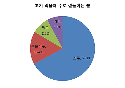 외식문화기업 강강술래는 지난달 24일부터 이달 6일까지 역삼점, 서초점, 홍대점에 방문한 외국인 고객 219명을 대상으로 ‘고기를 먹을 때 함께 마시는 술’에 대해 조사한 결과, 응답자 중 67.1%(147명)가 ‘소주’를 1위로 꼽았다고 7일 밝혔다.