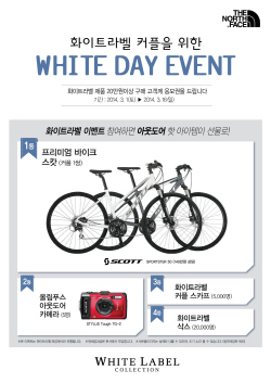 ‘화이트라벨 커플을 위한 화이트데이 이벤트’는 노스페이스 화이트라벨 매장에서 제품을 20만원 이상 구매한 고객에게 응모권을 증정하는 이벤트로 추첨을 통해 1등 커플 1쌍에게 총 140만원 상당의 프리미엄 바이크 스캇 자전거 2대를, 2등 5명에게는 아웃도어 카메라를, 3등 5천명에게는 커플 스카프를, 4등 2만명에게는 아웃도어 양말을 증정한다. 보다 자세한 내용은 노스페이스 화이트라벨 홈페이지(www.thenorthfacewhitelabel.co.kr)를 참고하면 되며, 일부 매장은 이벤트에서 제외된다.