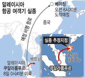 말레이시아항공 MH370편 보잉777-200 여객 항공기는 지난 8일 새벽 말레이시아 쿠알라룸푸르에서 중국 베이징을 날아가다 베트남 남부 해안과 말레이시아 영해 사이에서 실종됐다. 사고기에는 승객 227명과 승무원 12명 등 239명이 타고 있었다. 국적별로는 중국인이 153명으로 가장 많았다.