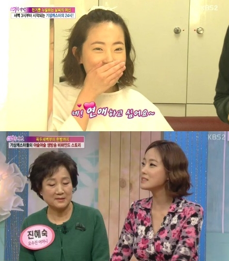 스튜디오에서 이어진 대화에서는 자신의 실수 경험을 털어놨다. “현재 방송 3년차”라고 밝힌 그는 “‘굿모닝 대한민국’에서 아침 6시에 날씨를 전해야했다. 어느 날 아침 눈을 떴더니 밖에 해가 떠 있더라. 원래는 4시에 출근을 해야 했는데 햇살이 나를 비추고 있더라. 일요일이었으면 좋겠다고 생각했다”고 말해 ‘허당’스러운 면모를 드러냈다.
