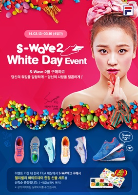 최근 출시한 일명 손연재 워킹화 ‘에스 웨이브(S-WAVE)2’를 휠라 오프라인 매장에서 구매하면, 고급 젤리 브랜드 ‘젤리 벨리’의 제품으로 구성된 화이트데이 기프트를 선물로 증정받을 수 있다.