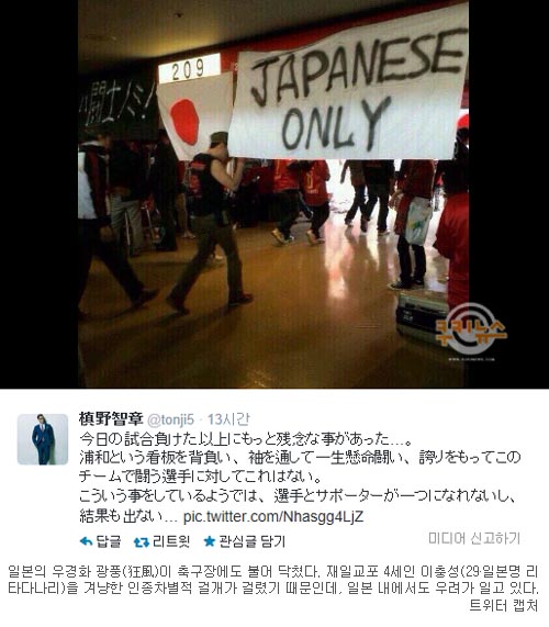 걸개는 최근 우라와에 입단한 이충성(29·일본명 리 타다나리)을 겨냥했다는 분석이다.