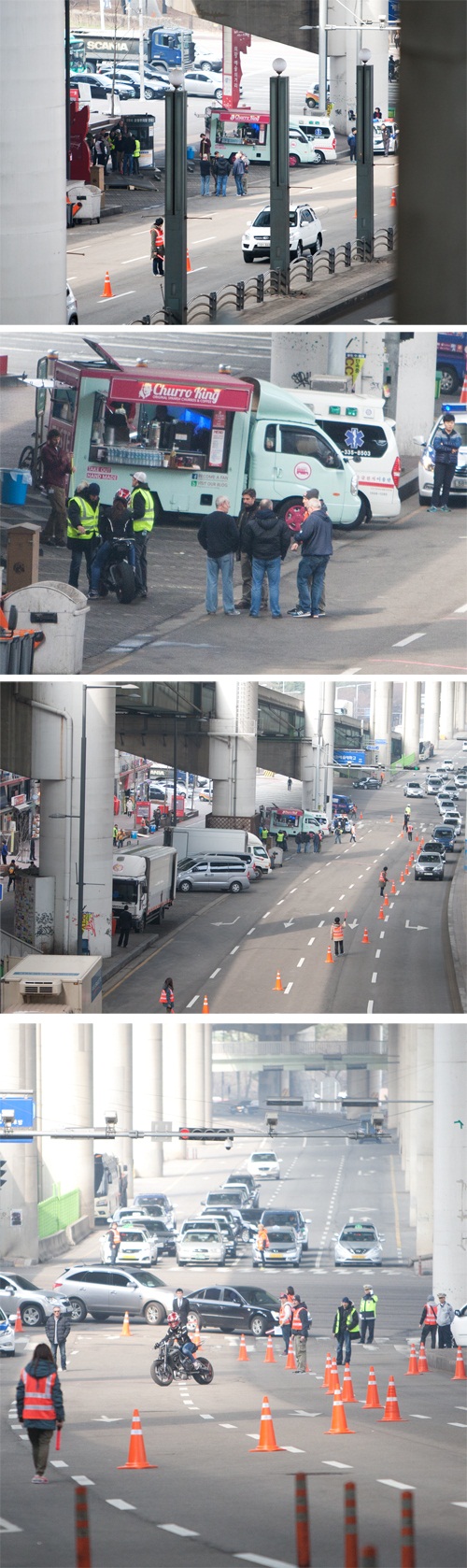 작성자는 “4월에 찍는다더니 일정을 당긴 것 아니느냐”고 추정하며, “동선을 보면 건물 안에 바이크 두 대가 서있고 육교 위에 작업자가 있다”며 현장 상황을 전했다.
