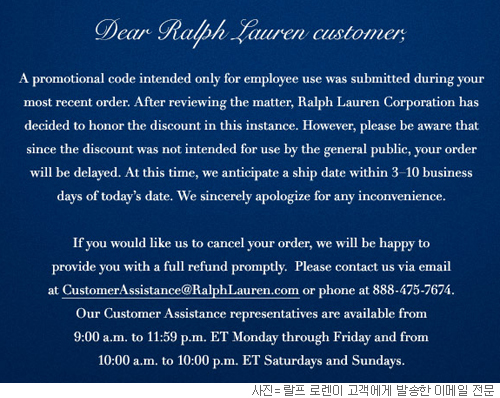 랄프 로렌은 20일 고객에게 발송한 이메일에서 “직원 할인코드를 이용한 최근 거래 내역을 검토한 뒤 할인 구매를 인정하기로 했다”며 “하지만 모두에게 할인해줄 목적으로 벌어진 상황이 아니라는 점을 분명하게 밝힌다”고 전했다. 업체는 배송 기간의 지연 가능성을 강조하면서 “불편을 끼쳐 진심으로 사과한다”고 고개를 숙였다. 그러나 “주문을 취소할 경우에는 기쁜 마음으로 전액 환불 조치하겠다”며 마지막으로 주문 취소를 유도했다.