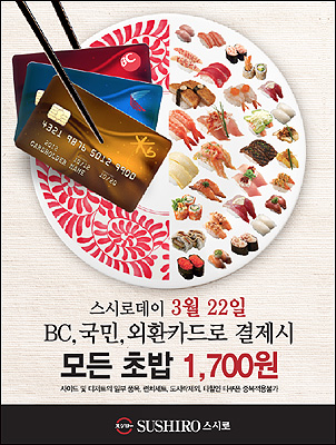 [쿠키 생활] 세계 최대의 회전초밥 레스토랑 스시로한국이 오는 22일 스시로데이를 맞아 국민 비씨 외환카드로 결제하는 고객들을 대상으로 모든 메뉴 1700원 균일가 행사를 진행한다.