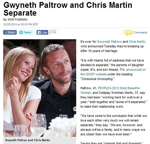 [쿠키 연예] 배우 귀네스 팰트로(41)와 영국 밴드 콜드플레이 멤버 크리스 마틴(37)이 11년 결혼 생활에 마침표를 찍었다.