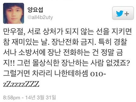 만우절을 하루 앞둔 지난 달 31일 양요섭은 자신의 트위터에 “만우절, 서로 상처가 되지 않는 선을 지키면 참 재미있는 날. 장난전화 금지. 특히 경찰서나 소방서에 장난 전화하는 건 정말 금지! 그런 몰상식한 장난하는 사람 없겠죠?”라며 “그럴 거면 차라리 나한테 하세요”라는 글을 남겨 시선을 끌었다.