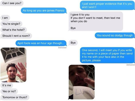 제임스 프랭코는 최근 뉴욕에서 크리스 오다우드가 출연하는 연극을 관람하러 갔다가 18세 소녀팬 루시(Lucy Clode)를 만났다. 당시 두 사람은 함께 사진과 동영상을 찍었다. 루시가 이 영상을 자신의 SNS에 공유하면서 제임스를 태그해 두 사람 인연은 온라인으로 이어졌다.