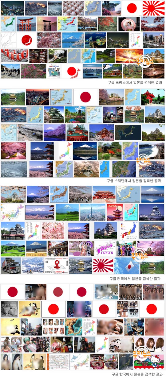 포털사이트 구글의 각 나라 사이트에서 ‘일본’을 검색한 결과 유독 한국에서만 성적인 이미지로 점철된 결과가 나온다는 글이 일본의 인터넷을 달구고 있다. 혐한 네티즌들은 “한국인 머릿속에는 에로만 가득 차 있나?”며 비웃고 있다.