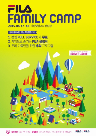 휠라코리아는 5월과 9월 2차례에 걸쳐 ‘2014휠라 패밀리 캠프(FILA FAMILY CAMP)’를 진행한다. 다음달에 개최되는 1차 캠핑은 17일부터 18일까지 가평 햇살고요 캠핑장에서 진행되며