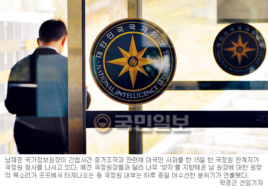 [쿠키 정치] 남재준 국가정보원장이 15일 서울시 공무원 간첩사건 증거조작과 관련해 대국민 사과를 하자 국정원 내부는 침통한 분위기가 역력하다.