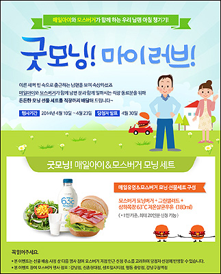 이번 이벤트는 모스버거와 매일아이가 공동으로 진행하며, 오는 23일까지 매일아이 홈페이지 내 ‘굿모닝 마이러브’ 게시판(http://2url.kr/ajSm)에 접속해 남편의 이름과 연락처, 직장 주소를 입력하고 300자 이내의 굿모닝 메시지를 작성하면 된다. 신청자 중 총 10명을 선정해 남편의 직장으로 최대 20인분의 모스버거 모닝세트와 매일유업 상하목장 63℃ 우유를 직접 배달해 준다.