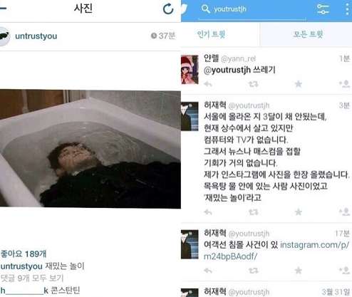 허재혁은 17일 오전 0시20분쯤 자신의 인스타그램에 “재밌는 놀이”라며 물이 채워진 욕조에 옷 입은 채 들어가 누워있는 사진을 올렸다. 사진은 온라인상에 빠르게 퍼졌고 네티즌들은 공분했다. 각종 욕설과 함께 “지금 이런 사진을 올릴 때냐” “너무 놀랐다. 도대체 정신이 있나” “소름 돋는다. 지금 이게 할 짓이냐” 등의 반응이 쏟아졌다.
