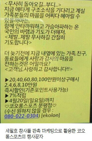 코오롱스포츠는 행사문자에 여객선 침몰 참사를 당한 가족들을 위로하며 ‘더 늦기 전에 가족, 친구, 동료들에게 사랑과 감사의 마음을 전하는 것은 어떨까요?’라는 문구와 함께 오는 20일까지 일정 금액 이상 구매하면 즉시 할인과 7% 포인트 적립 등의 혜택을 안내했다.