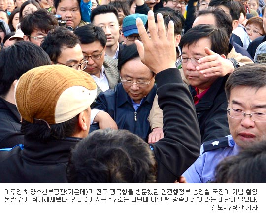[쿠키 사회] 이주영 해양수산부장관과 진도 팽목항을 방문했던 안전행정부 송영철 국장이 기념 촬영 논란 끝에 직위해제됐다. 인터넷에서는 “구조는 더딘데 이럴 땐 광속이네”이라는 비판이 일었다.