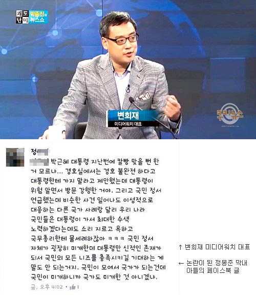 변 대표는 전날에도 정군을 두둔하는 글을 수차례 올렸다. 그는 “학생 때는 이 주장 저 주장 다 하면서 성장하는 건데 정몽준 아들이라는 이유로 정치적 책임을 지고 있다”며 “재수생의 페북글을 대대적으로 보도해 유가족이 마음을 찢어 놓은 게 바로 미개한 언론사들”이라고 주장했다.